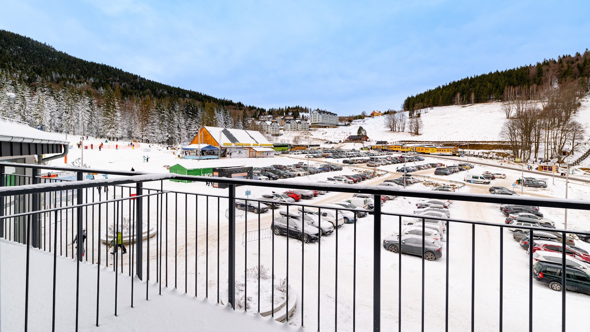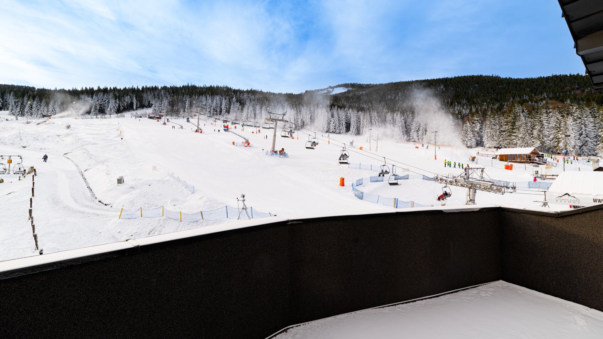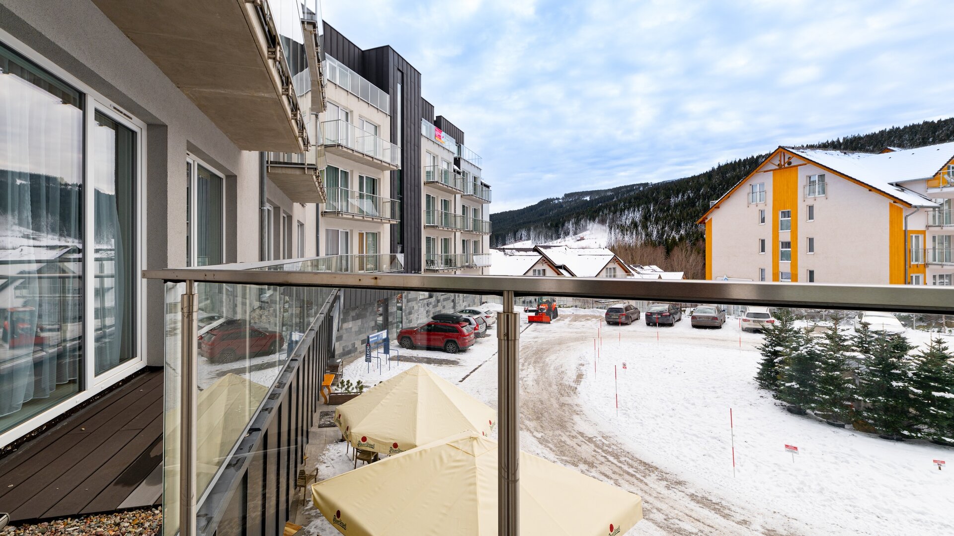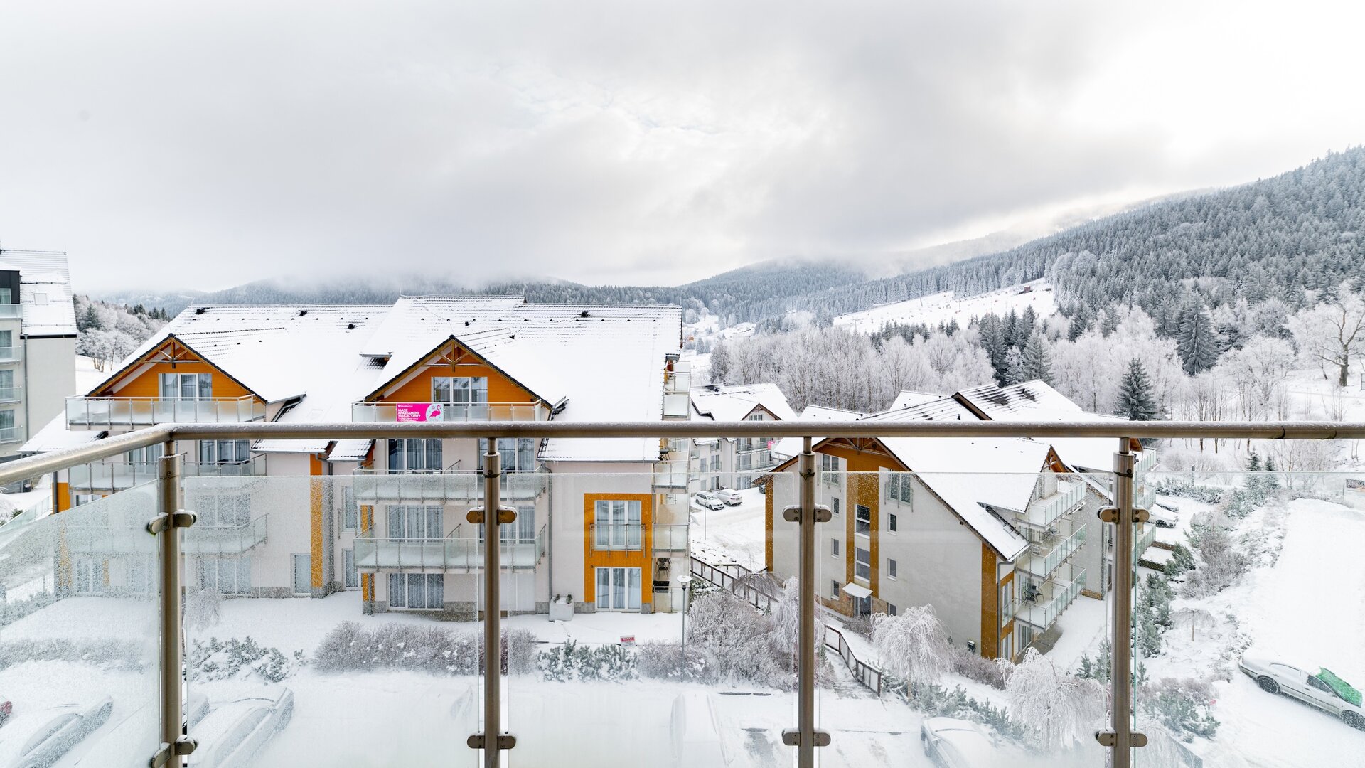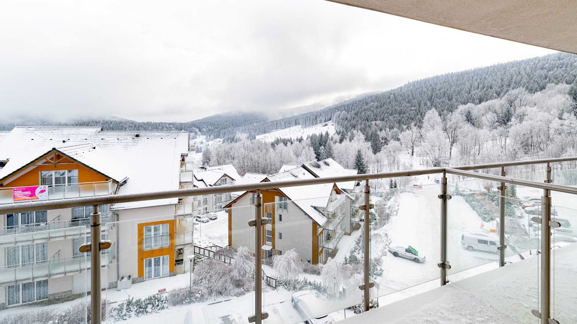 Item39, Link to Larger Image, Widok na zaśnieżony krajobraz z balkonu budynku